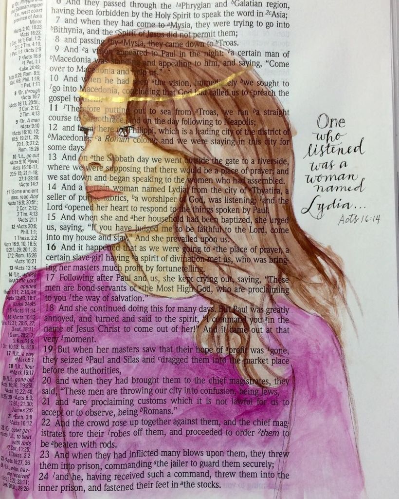 - Lydia’s introduction = interesting – text: One of those women was Lydia, a Gentile God-worshipper from the city of Thyatira, a dealer in purple cloth. As she listened, the Lord enabled her to embrace Paul’s message.[5] → Let’s break this down a bit because there’s a lot here.