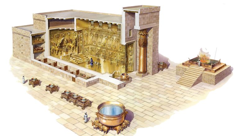 - The Lord’s word came to Solomon, Regarding this temple that you are building: If you follow my laws, enact my regulations, and keep all my commands faithfully, then I will fulfill for you my promise that I made to your father David. I will live among the Israelites. I won’t abandon my people Israel. So Solomon constructed the temple and completed it. He built the walls within the temple with cedar planks, paneled from the floor to the ceiling. He overlaid the floor of the temple with pine planks. At the back of the temple he built thirty feet of cedar panels from the floor to the ceiling. Solomon built the inner sanctuary, the most holy place. In front of this, the main hall was sixty feet. The cedar inside the temple was carved with gourds and blossoming flowers. The whole thing was cedar. No stone was seen. He set up the inner sanctuary inside the temple so that he could put the chest containing the Lord’s covenant there. The inner sanctuary was thirty feet in length, width, and height. Solomon overlaid it with pure gold and covered the altar with cedar. Solomon covered the temple’s interior with pure gold. He placed gold chains in front of the inner sanctuary and covered it with gold. He overlaid the whole temple inside with gold until the temple was completely covered. He covered the whole altar that was in the inner sanctuary with gold. He made two winged creatures of olive wood for the inner sanctuary, each fifteen feet high. The wings of the first winged creature were each seven and a half feet long. It was fifteen feet from the end of one wing to the end of the other. The second winged creature also measured fifteen feet. Both winged creatures had identical measurements and form. The height of both winged creatures was fifteen feet. Solomon placed the winged creatures inside the temple. Their wings spread out so that the wing of the one touched one wall and the wing of the other touched the other wall. In the middle of the temple, the wings of the two-winged creatures touched each other. He covered the winged creatures with gold. Solomon carved all the walls of the temple—inner and outer rooms—with engravings of winged creatures, palm trees, and blossoming flowers. He also covered the floor of the temple with gold, in both the inner and the outer rooms. He made the doors of the inner sanctuary from olive wood and carved the doorframes with five recesses. He overlaid the two olive-wood doors with gold-plated carvings of winged creatures, palm trees, and blossoming flowers. He made the door of the main hall with doorframes of olive wood with four recesses. The two doors of pinewood each pivoted on a socket. Solomon carved winged creatures, palm trees, and blossoming flowers, and covered them with gold. He built the inner courtyard with three rows of cut stone followed by one row of trimmed cedar. Solomon laid the foundation of the Lord’s temple in the fourth year in the month of Ziv. He finished the temple in all its details and measurements in the eleventh year during the eighth month, the month of Bul. He built it in seven years.[1] → What a temple, right? This was a temple of grandeur and majesty! This was a temple of reverence and veneration! This was a temple that was generations upon generations in the making.