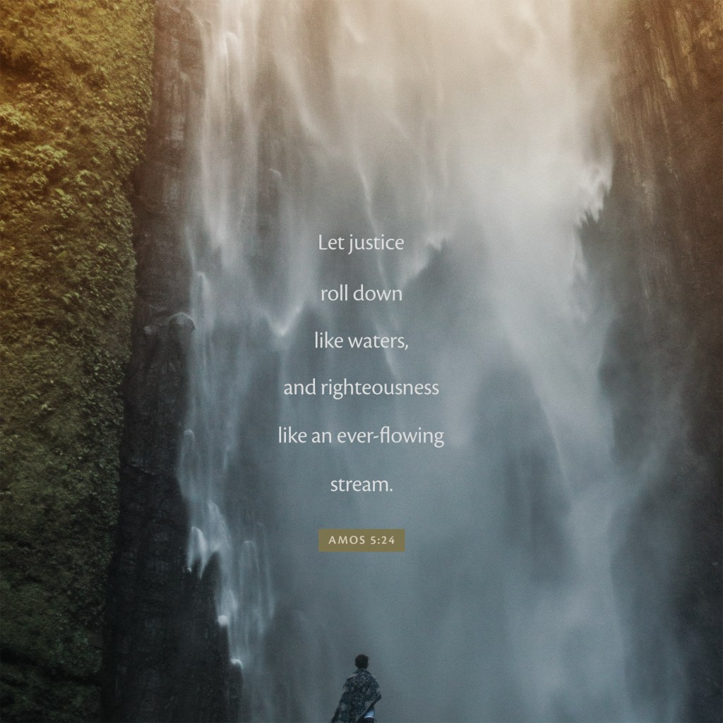 - And then, in the face of this rebuke, we hear the words of Amos that are probably the most well-known – text: But let justice roll down like waters, and righteousness like an ever-flowing stream.[9] → Remember what we affirmed at the beginning of the sermon: Water is essential. Essential to the function and continuation of life on our planet. Essential to the function and continuation of life within our bodies. Essential to the function and continuation of our life of faith. Water is essential. And here’s God, through Amos, calling for justice to roll down like waters and righteousness like an ever-flowing stream. Justice like waters. Justice like waters. Justice like waters. So if water is essential … then so is justice.